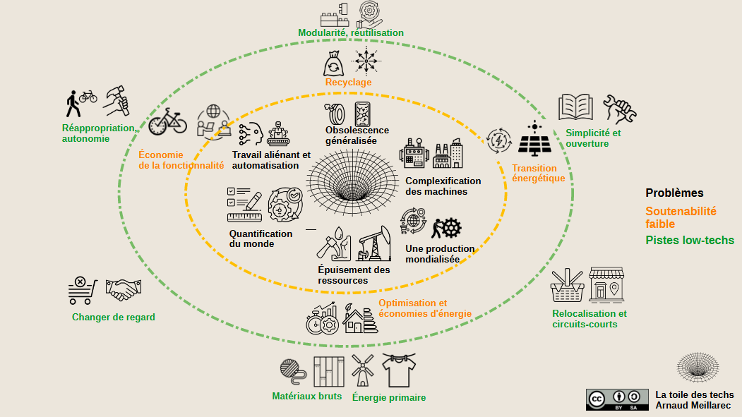 Dans cette optique, et à cet état de cheminement logique, la fresque des low-techs simplifiée, remixage initial de la fresque des low-techs, se métamorphose en "toile des Techs". Avec pour ambition de proposer autant de déclinaisons sectorielles que nécessaire. Le choix de ce nom se voit renforcé par l'ambiguïté maintenue entre technique et technologie ainsi que par la consonnance de "la toile des Techs" détox.