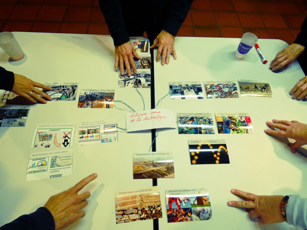 Le deuxième écueil provient du nouveau système de jeu mis en place : un cercle noir central regroupe six problématiques majeures de la société industrielle. Du centre du cercle jaillissent six branches sur lesquelles se positionnent les cartes noires problématiques, puis, en s'éloignant du centre les cartes oranges correspondant à des pistes partielles relevant d'une soutenabilité faible insuffisante. A l'extérieur du cercle, au bout des branches, les cartes vertes établissent les principes de la low-tech. L'idée s'impose peu à peu de créer des extensions sur ce sytème de jeu, spécialisées chacune par thématique. Par exemple, jardinage, alimentation. L'extérieur du cercle s'étend à volonté par définition. La carte "fauchage à la main" y trouve sa place naturellement. Mais comment ajouter des cartes sur l'informatique, puisqu'elles n'appartiennent pas au cercle vert low-tech ? Solution envisagée : les cartes des extensions se positionneraient sur n'importe quel cercle. Ce placement sur la bonne branche et à la bonne distance du centre devient ainsi l'enjeu de la phase d'extension. La discussion autour du choix de la couleur participerait à la réflexion collective enrichissante pour tous.